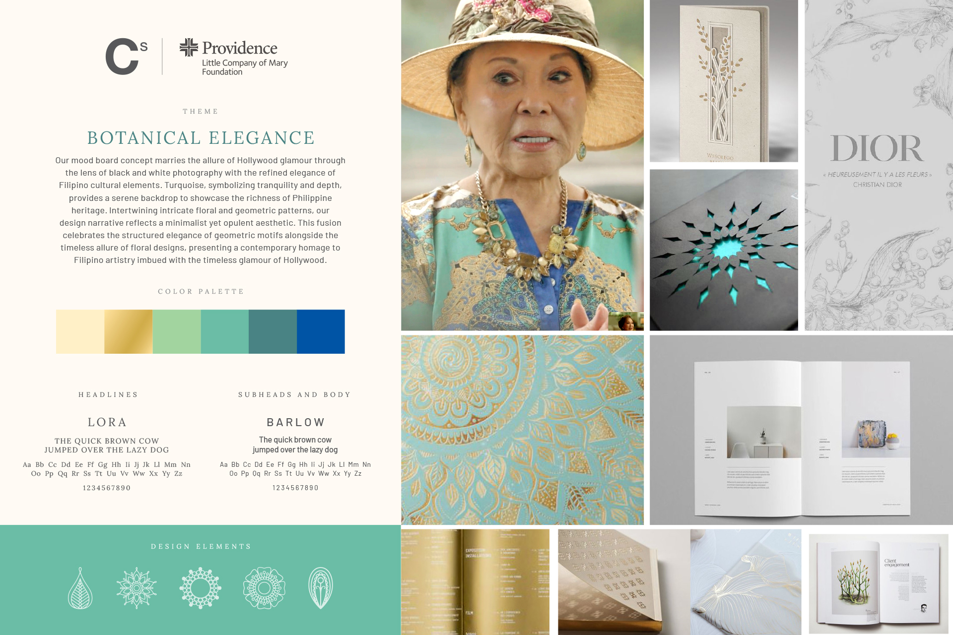 Crafted for Providence Little Company of Mary Foundation, this proposal blends the timeless grace of Hollywood glamour with the rich cultural artistry of the Philippines — an homage to the donor's refined style and heritage. Rooted in the theme of Botanical Elegance, the design features tranquil turquoise tones, intricate geometric motifs, and delicate floral patterns to evoke a serene yet luxurious feel. From its custom die-cut cover to its minimalist layout, every element reflects a deep respect for tradition and simplicity — strategically designed to honor the donor’s legacy while inspiring meaningful support for the Foundation’s mission.